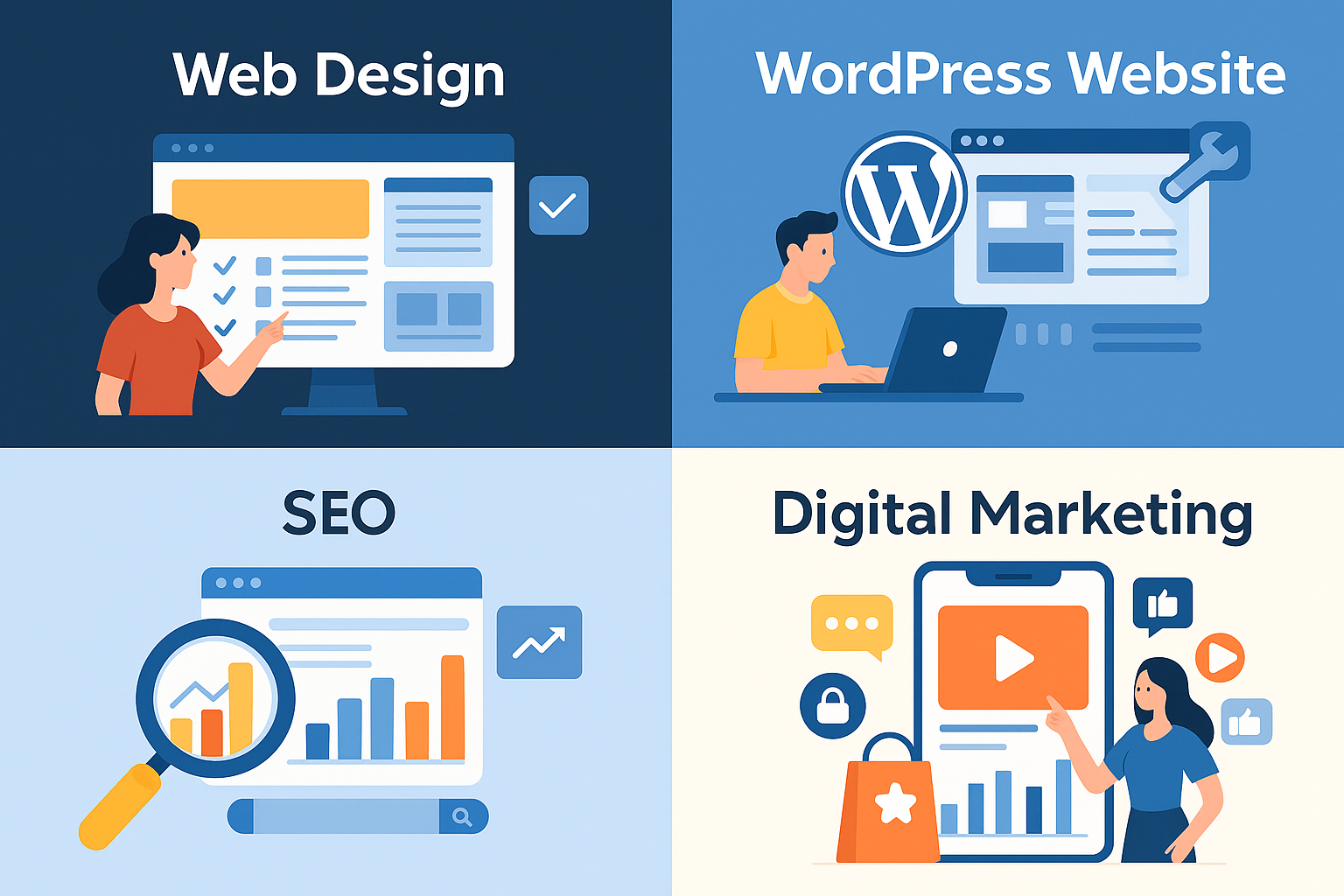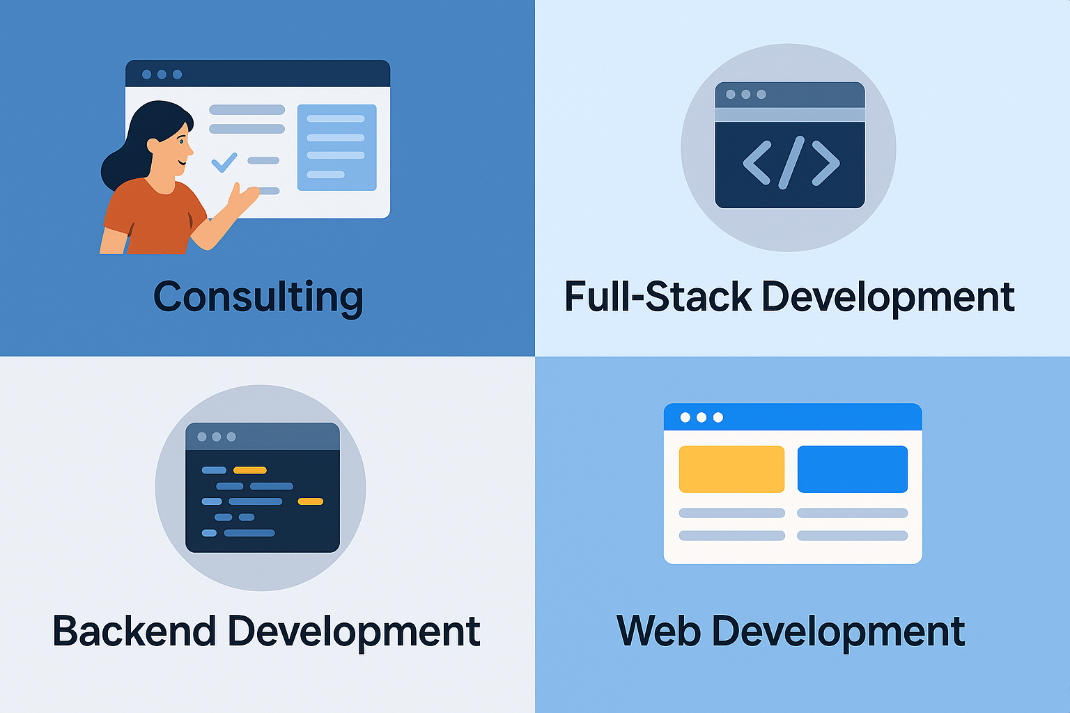 Our services cover the complete digital landscape β from Consulting, Full-Stack, Backend & Web Development, Web Design, and WordPress to SEO, Digital Marketing, Video Editing, Logo Design, Software Development, and AI-powered innovations. We combine creativity, technical expertise, and strategic thinking to help our clients grow and stay competitive in the digital age.
